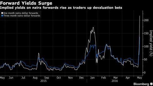 Three-month naira non-deliverable forwards rose by 14 percent, the most on a closing basis since the contracts began trading in March 2011, to a record 267 against the dollar at 4:06 p.m. in London. One-month forwards jumped 11 percent to 238, bringing their implied yield -- the annualized amount that investors would get if they bought the contract and there was no change in the spot price at the end of the period -- to 217 percent, also a record. Contracts maturing in a year climbed 5.7 percent to 314, suggesting a 58 percent drop in the naira from the interbank rate of 199.05 per dollar.