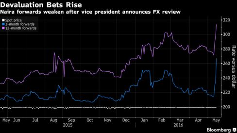While Nigeria has held the naira at 197-199 since March 2015, even as falling oil prices cause government revenue and export earnings to plunge, Vice President Yemi Osinbajo announced a review of the currency regime on May 11 that “may feature” a devaluation. That was a shift from recent comments by President Muhammadu Buhari and came on the same day the government allowed fuel importers to buy foreign-exchange on the black market, rather than just from the central bank and oil companies. The unofficial rate weakened to about 360 to the dollar on Monday from 320 a week ago.